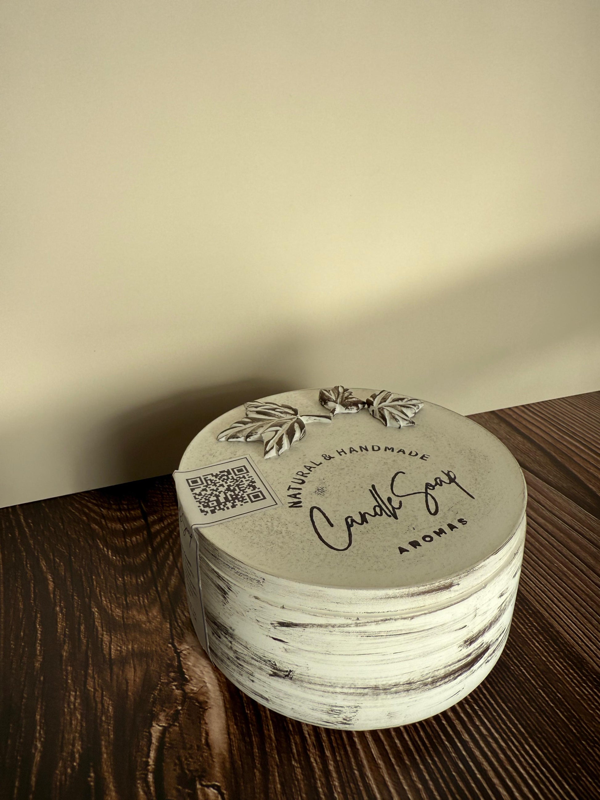 Each candle is handcrafted, one by one, in vintage-style resin vessels with softly crackling wooden wicks, filling the space with cozy warmth. The lids are adorned with hand-crafted autumn leaves, painted with an aging technique to achieve an antique finish, making every piece a unique work of art.